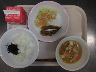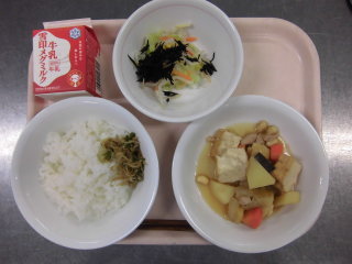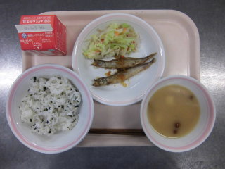 | わかめごはん 魚のぴりからやき おかかあえ けんちん汁 牛乳 |