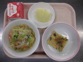 | タンメン 野菜チヂミ りんご 牛乳 |