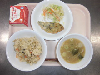 | 鶏五目ごはん 魚の味噌マヨネーズ焼き レモン醤油和え 味噌汁 牛乳 |