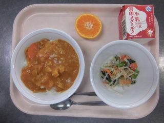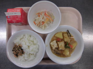 | チキンカレーライス 豆腐入りサラダ りんご 牛乳 |