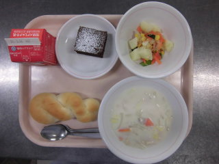 | ミルクパン 白菜と豆のクリームシチュー ゴママヨドレサラダ チョコレートブラウニー 牛乳 |