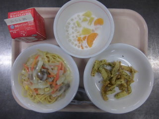 | クリームスープスパゲティ 青のりポテト フルーツタピオカ 牛乳 |