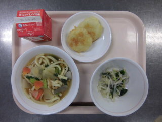 | けんちんうどん いももち団子 もやしの和え物 牛乳 |