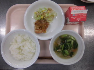 | ごはん 油淋鶏 こんにゃくサラダ 野菜スープ 牛乳 |