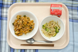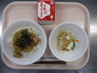 | 焼き鳥丼 いかともやしの和え物 牛乳 |