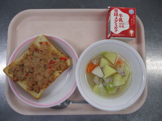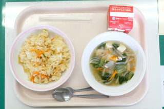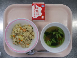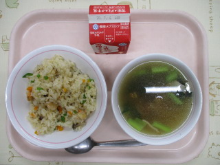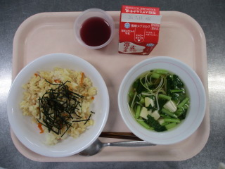 | 小松菜と鮭の混ぜご飯 じゃがもちスープ 牛乳 |