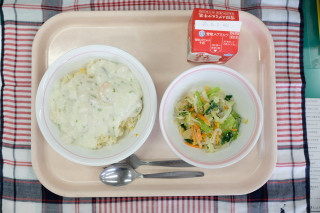 | えびクリームライス アーモンドサラダ 牛乳 |