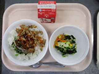 | こまツナそぼろ丼 味噌汁 牛乳 |