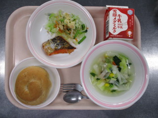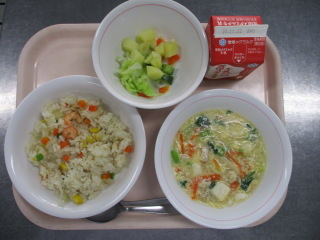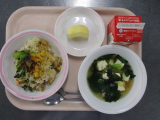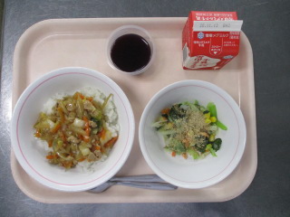 <食材の産地> 小松菜・・・栃木県 にんにく・・・青森県 パセリ・・・千葉県 じゃが芋・・・北海道 玉葱・・・北海道 にんじん・・・北海道 キャベツ・・・千葉県 レモン・・・愛媛県 ※牛乳は、茨城県・千葉県・群馬県・栃木県・北海道・山形県・宮城県の原乳を使用しています。 ※現在出荷制限されている食材については、給食に使用していません。