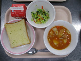 <食材の産地> 小松菜・・・足立区産 じゃが芋・・・北海道 玉葱・・・北海道 にんじん・・・千葉県 キャベツ・・・愛知県 白菜・・・茨城県 セロリー・・・愛知県 生姜・・・熊本県 パセリ・・・愛知県 ※牛乳は、茨城県・千葉県・群馬県・栃木県・北海道・山形県・宮城県の原乳を使用しています。 ※現在出荷制限されている食材については、給食に使用していません。