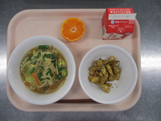 <食材の産地> ねぎ・・・岩手県 にんにく・・・青森県 生姜・・・熊本県 にんじん・・・青森県 キャベツ・・・茨城県 もやし・・・栃木県 玉葱・・・北海道 にら・・・茨城県 じゃが芋・・・北海道 みかん・・・福岡県 ※牛乳は、茨城県・千葉県・群馬県・栃木県・北海道・山形県・宮城県の原乳を使用しています。 ※現在出荷制限されている食材については、給食に使用していません。