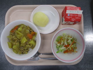 <食材の産地> じゃが芋・・・北海道 玉葱・・・北海道 にんじん・・・千葉県 生姜・・・熊本県 にんにく・・・青森県 もやし・・・栃木県 キャベツ・・・千葉県 りんご・・・山形県 ※牛乳は、茨城県・千葉県・群馬県・栃木県・北海道・山形県・宮城県の原乳を使用しています。 ※現在出荷制限されている食材については、給食に使用していません。