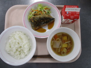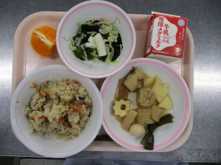 <食材の産地> にんじん・・・千葉県 じゃが芋・・・北海道 大根・・・神奈川県 キャベツ・・・愛知県 もやし・・・栃木県 レモン・・・広島県 せとか・・・愛媛県 ※牛乳は、茨城県・千葉県・群馬県・栃木県・北海道・山形県・宮城県の原乳を使用しています。 ※現在出荷制限されている食材については、給食に使用していません。