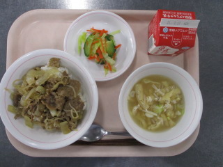 <食材の産地> 玉葱・・・北海道 キャベツ・・・愛知県 にんじん・・・千葉県 もやし・・・栃木県 大根・・・千葉県 ねぎ・・・千葉県 えのき・・・長野県 ※牛乳は、茨城県・千葉県・群馬県・栃木県・北海道・山形県・宮城県の原乳を使用しています。 ※現在出荷制限されている食材については、給食に使用していません。