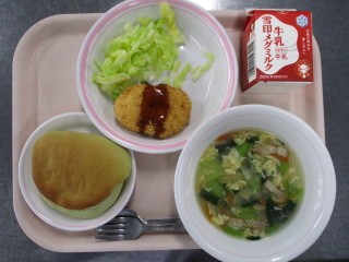 <食材の産地> 小松菜・・・足立区産 玉葱・・・北海道 エリンギ・・・新潟県 ニンニク・・・青森県 キャベツ・・・愛知県 にんじん・・・千葉県 ※牛乳は、茨城県・千葉県・群馬県・栃木県・北海道・山形県・宮城県の原乳を使用しています。 ※現在出荷制限されている食材については、給食に使用していません。