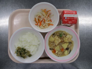 <食材の産地> にんにく・・・青森県 パセリ・・・静岡県 じゃが芋・・・北海道 にんじん・・・千葉県 玉葱・・・北海道 生姜・・・熊本県 もやし・・・栃木県 キャベツ・・・愛知県 ※牛乳は、茨城県・千葉県・群馬県・栃木県・北海道・山形県・宮城県の原乳を使用しています。 ※現在出荷制限されている食材については、給食に使用していません。