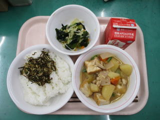 <食材の産地> キャベツ・・・愛知県 にんじん・・・愛知県 玉葱・・・北海道 じゃが芋・・・北海道 生姜・・・熊本県 ※牛乳は、茨城県・千葉県・群馬県・栃木県・北海道・山形県・宮城県の原乳を使用しています。 ※現在出荷制限されている食材については、給食に使用していません。