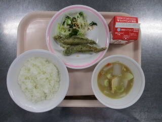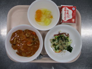 <食材の産地> キャベツ・・・愛知県 にんじん・・・愛知県 玉葱・・・北海道 じゃが芋・・・熊本県 生姜・・・北海道 パセリ・・・静岡県 ※牛乳は、茨城県・千葉県・群馬県・栃木県・北海道・山形県・宮城県の原乳を使用しています。 ※現在出荷制限されている食材については、給食に使用していません。