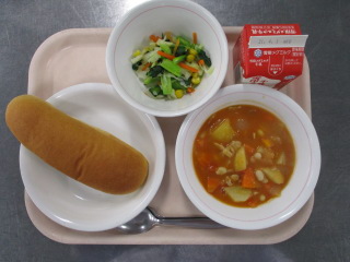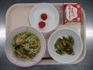 <食材の産地> じゃが芋・・・鹿児島県 にんじん・・・徳島県 玉葱・・・北海道 さやいんげん・・・長崎県 キャベツ・・・愛知県 もやし・・・栃木県 ※牛乳は、茨城県・千葉県・群馬県・栃木県・北海道・山形県・宮城県の原乳を使用しています。 ※現在出荷制限されている食材については、給食に使用していません。