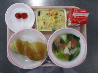 <食材の産地> 小松菜・・・足立区産 にんじん・・・愛知県 玉葱・・・北海道 しめじ・・・長野県 じゃが芋・・・北海道 生姜・・・熊本県 苺・・・静岡県 ※牛乳は、茨城県・千葉県・群馬県・栃木県・北海道・山形県・宮城県の原乳を使用しています。 ※現在出荷制限されている食材については、給食に使用していません。