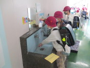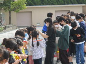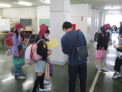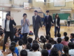 朝、朝会を行う前に対面式を行いました。6年生が事前に作成したメダルを、1年生一人一人に首から提げてあげました。6年生からもらった手作りのメダルをもらった1年生は、とてもうれしそうな顔をしていました。