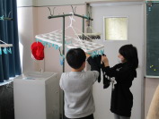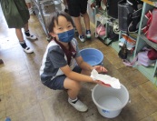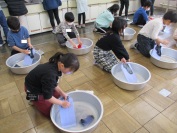 今日は、3年生の社会科「わたしたちの区のようす」の学習を紹介します。3年生は社会科で足立区の様子の移り変わりについて学習をしています。今までの学習の中で、人口の変化や土地の利用、交通の変化、生活の移り変わりになどについて調べ、足立区の様子について理解することができました。今日は、発展的な学習として、洗濯板を使って洗濯をする体験をしました。自分の手で洗濯することで大変さや今の生活の便利さを改めて感じていました。体験や経験をすることでたくさんのことが学べた時間となりました。