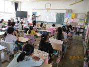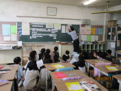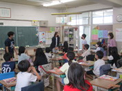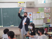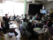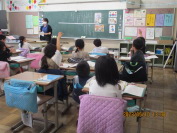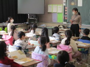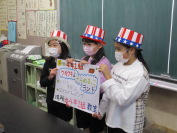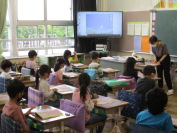 3年生の外国語活動では、国旗を見て、どこの国なのか、どんな挨拶の仕方なのかを学習していました。英語と日本語の違いに気付いていました。