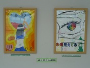 校内も改めてよく見て歩くと、メディアルーム前には「ポスターコンクール」入選作品が飾ってあります。他にも美術部作品や、美術の授業で作成した空想画「不思議なたまご」、そして7組教室前にも作品が展示されています。
