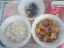 | わかめごはん カレー肉じゃが こまツナサラダ 牛乳 |