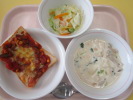 | 夏野菜ピザトースト チキンチャウダー 小エビのサラダ 牛乳 |
