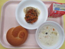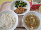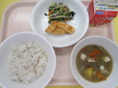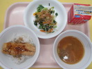 | 小松菜そぼろご飯 かえり煮干しの甘辛揚げ こんにゃく入り海藻サラダ 牛乳 |