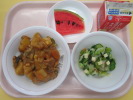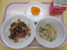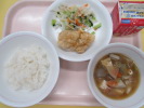 | ご飯 鶏肉のくわ焼き わかめサラダ かきたま汁 牛乳 |