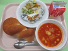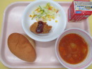 | 胚芽コッペパン スパニッシュオムレツ ミネストローネ フルーツヨーグルト 牛乳 |