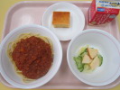 | スパゲティミートソース りんごのサラダ さつまいもケーキ 牛乳 |