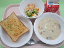 | ミルクパン 魚のムニエル トマトドレッシングサラダ クリームスープ 牛乳 |