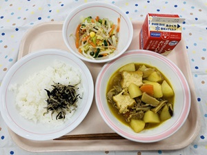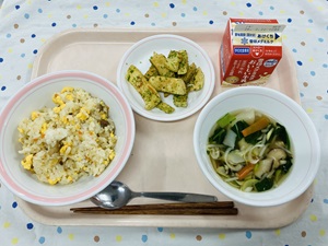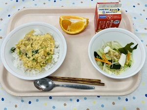 「たこやきポテト」は梅二小では久しぶりのメニューです。じゃがいもを蒸してつぶして切り分けたものに、たこを一つずつ丸めて揚げてつくります。上からソース、青のりをかけてまるで本物のたこやきのよう・・・!とても手間のかかるメニューですが、給食室のチームプレイで無事に出来上がりました◎