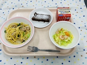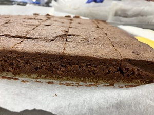 14日のバレンタインデーにちなんで、チョコレートを使ったケーキ「ガトーショコラ」を給食室で手作りしました。給食ではコーティングチョコレートという、製菓用のキューブ状のものをつかいます。チョコレートを生地に混ぜることで濃厚な味を楽しむことができました。