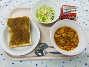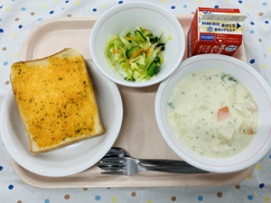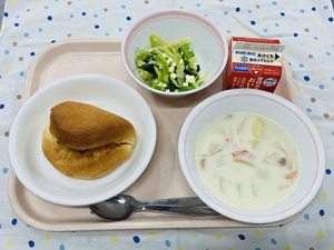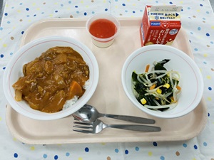 今日の献立は明日の「6年生を送る会」を記念したスペシャル献立です!ハヤシライスにはいつも豚肉を使用していますが、今回は特別に牛肉にしてみました。また、ミルクゼリーの上には生いちごを使ったソースをかけて紅白色に。食べているうちにミルクゼリーと混ざることでほんのり桜色にもなり、まさにお祝いにピッタリのデザートです◎