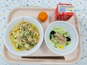 豆乳ごま担々麺は、野菜がたっぷりとれて栄養面でも優秀なメニュー。給食室で味見をしたところ、辛さがいまいち足りなかったのでラー油を数滴いれてみたら、ちょうどよいピリ辛具合になりました◎