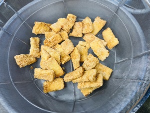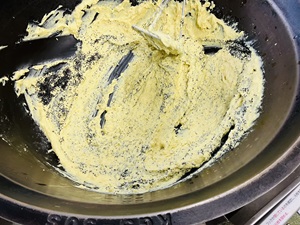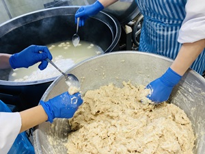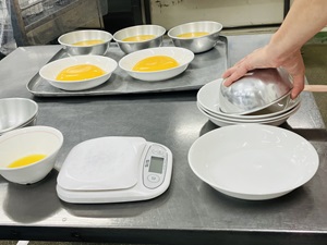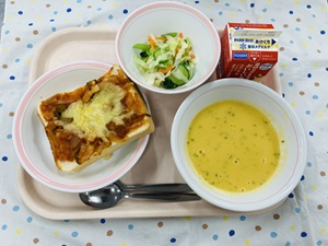 おさつトーストはさつまいもをつぶしてペースト状にしたものを食パンに塗っています。「シルクスイート」という甘みの強いさつまいもを使っています。牛乳や生クリームを加えることでしっとりとしたゆるさになりました。調理員さんがパンのはじっこまで塗ってくれました^^