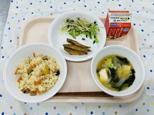 ごはんには蒸したさつまいもがはいっています。紅あずま、という品種で、ホクホクとした食感がごはんにとっても合います◎