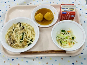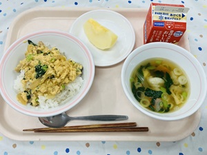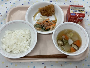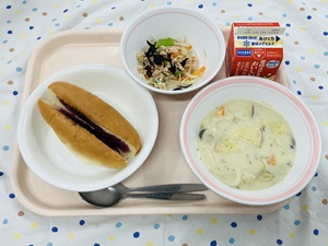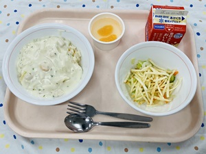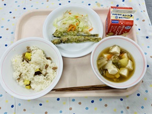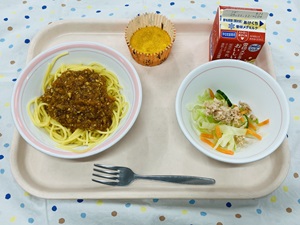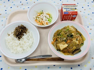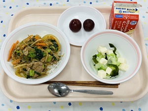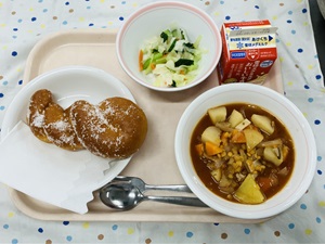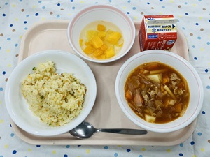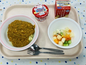 今日は6年生の連合運動会があるので応援メニューにしてみました。カレーにはひよこ豆(スペイン語でガルバンゾー)がはいっています。
