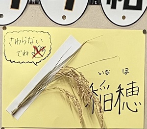 年に一度のコシヒカリ給食の日でした。魚沼市より稲穂が提供されたので給食室近くの掲示板に飾っています。