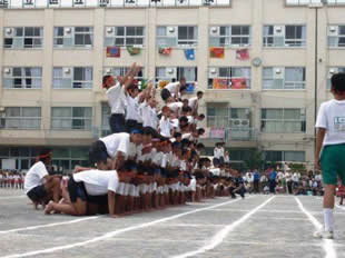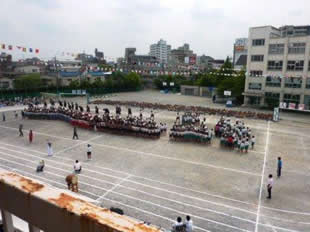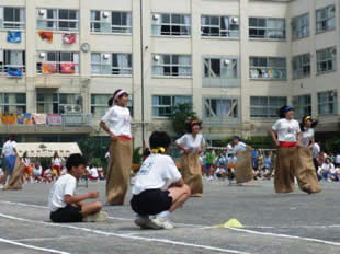 緑学年は、初めての運動会ということで多少のミスもありましたが二年、三年に負けじと頑張り全級リレー、三人四脚など特に学年種目の「矢切りの渡し」を成功させ、二学年は「大縄」三年生は「ムカデ競走」を」やり遂げました。