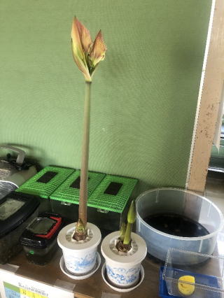 また、5月11日(月)以降の学校の予定は、まだ決まっていません。決まりましたら、学校メールでお知らせします。さて、写真はある教室にある「アマリリス」です。ひとつは球根を1日水にひたしてから土に植えた方で、もうひとつはそのままの土に植えたものです。さて、どちらの方が、成長が早いか考えてみましょう。