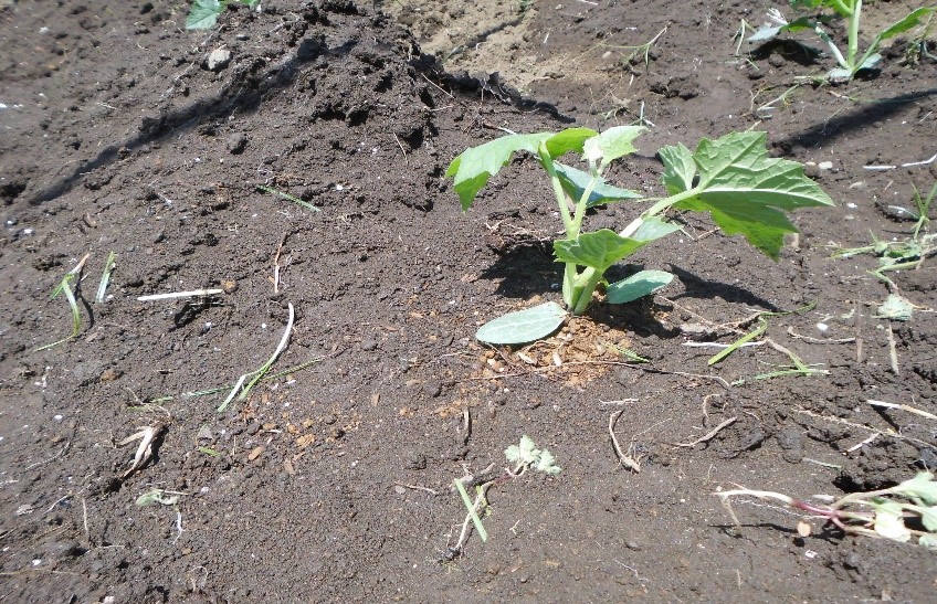 畑を耕してうねを作り、うねに穴を掘って、そこに苗を植え付けます。