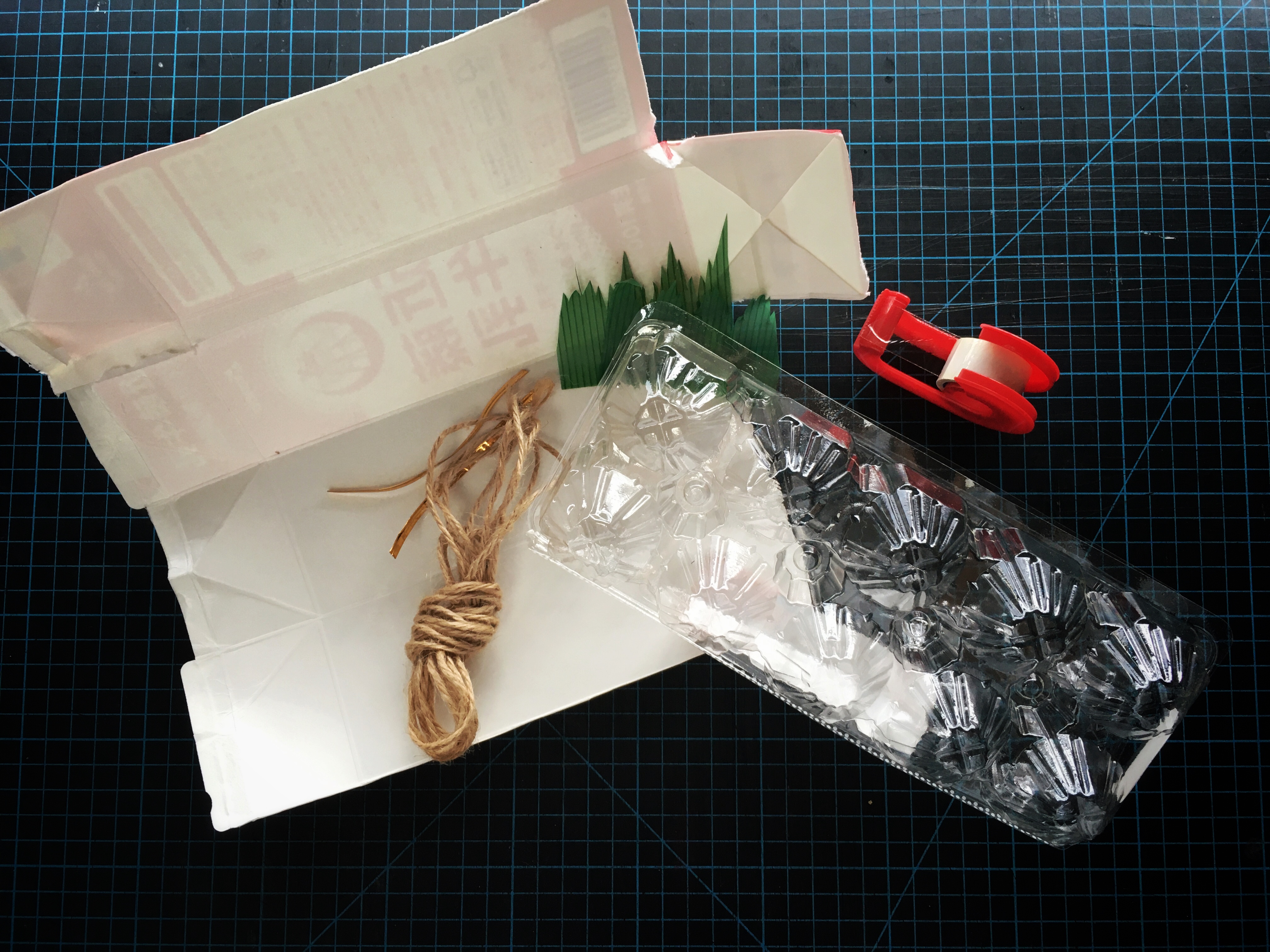 牛乳パック、お弁当の葉っぱ、卵のパック、麻糸が見つかりました。みなさんもおうちの人と相談しながら材料探しをしてみてください。