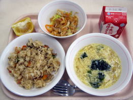 中華おこわ 揚げワンタンサラダ 中華たまごスープ いよかん 牛乳