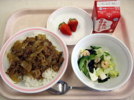 今日は、牛肉を使った献立でロシアの郷土料理「ビーフストロガノフ」を提供しました。牛肉はもものスライスを使い、玉葱と一緒に軟らかく煮ました。農家で育った牛は食肉センターに運ばれ、私たちが安心して食べられるように健康状態などを検査をしていることをお知らせしました。