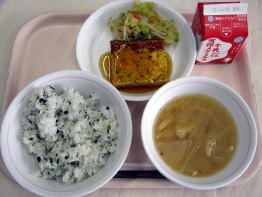 今日は、豆腐とたまごを使った擬製豆腐のくずあんかけを提供しました。卵焼きよりもフワッとした食感で、あんがかかっていてよりおいしく食べることが出来ました。また、8がつく日なので、主食にはソフト茎わかめを入れ、よく噛んで食べることを意識するようにお知らせしました。